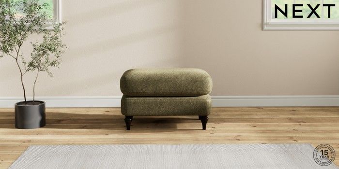6.12.1 Buy Sadie Deep Relaxed Sit Footstool Cotswold Chenille Dark Green High Slim Turned - Dark from the Next UK online shop Click here to use our accessible website