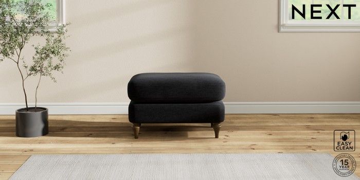 6.12.1 Buy Sadie Deep Relaxed Sit Footstool Fine Chenille Easy Clean Black High Slim Turned - Mid from the Next UK online shop Click here to use our accessible website