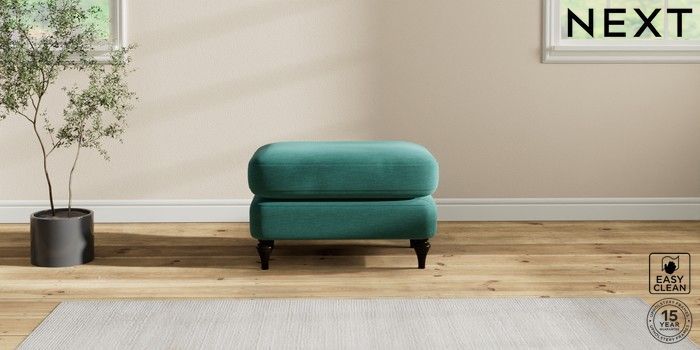 6.12.1 Buy Sadie Deep Relaxed Sit Footstool Fine Chenille Easy Clean Dark Juniper Green High Slim Turned - Dark from the Next UK online shop Click here to use our accessible website