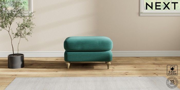6.12.1 Buy Sadie Deep Relaxed Sit Footstool Fine Chenille Easy Clean Dark Juniper Green High Slim Turned - Light from the Next UK online shop Click here to use our accessible website