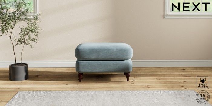 6.12.1 Buy Sadie Deep Relaxed Sit Footstool Fine Chenille Easy Clean Mid Blue High Slim Turned - Dark Brown from the Next UK online shop Click here to use our accessible website