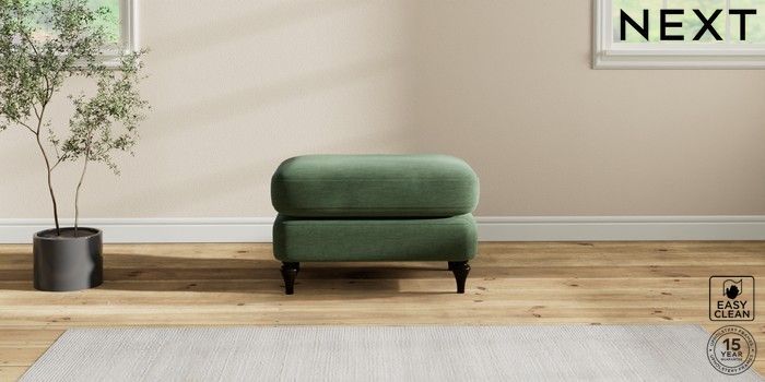 6.12.1 Buy Sadie Deep Relaxed Sit Footstool Fine Chenille Easy Clean Mid Khaki Green High Slim Turned - Dark from the Next UK online shop Click here to use our accessible website