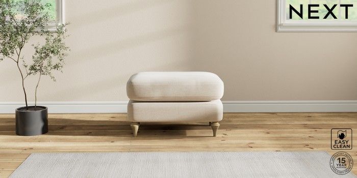 6.12.1 Buy Sadie Deep Relaxed Sit Footstool Fine Chenille Easy Clean Oyster High Slim Turned - Light from the Next UK online shop Click here to use our accessible website