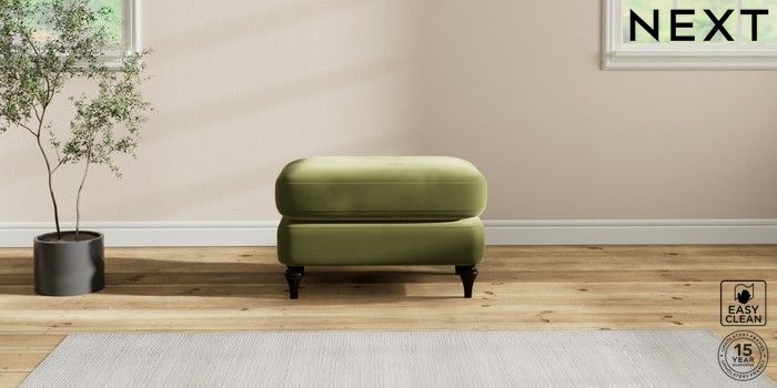 6.12.1 Buy Sadie Deep Relaxed Sit Footstool Plush Velvet Easy Clean Mid Olive Green High Slim Turned - Dark from the Next UK online shop Click here to use our accessible website