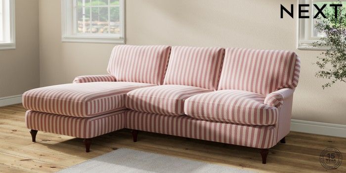 6.12.1 Buy Sadie Deep Relaxed Sit Medium Sofa Chaise - Left Hand Bold Chenille Stripe Dark Pink High Slim Turned - Dark Brown from the Next UK online shop Click here to use our accessible website