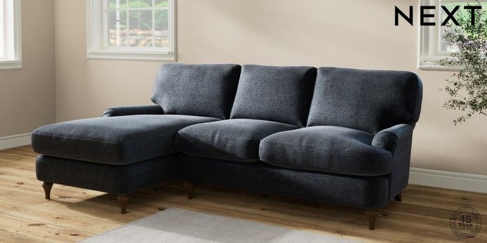 6.12.1 Buy Sadie Deep Relaxed Sit Medium Sofa Chaise - Left Hand Boucle Chenille Dark Slate Blue High Slim Turned - Mid from the Next UK online shop Click here to use our accessible website