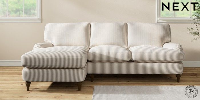 7.0.3 Buy Sadie Deep Relaxed Sit Medium Sofa Chaise - Left Hand Chenille Stripe Natural High Slim Turned - Mid from the Next UK online shop Click here to use our accessible website