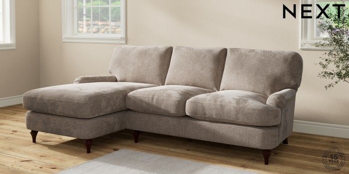 6.12.1 Buy Sadie Deep Relaxed Sit Medium Sofa Chaise - Left Hand Chunky Chenille Light Dove High Slim Turned - Dark Brown from the Next UK online shop Click here to use our accessible website