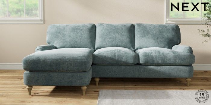 7.0.3 Buy Sadie Deep Relaxed Sit Medium Sofa Chaise - Left Hand Chunky Chenille Light Teal Green High Slim Turned - Light from the Next UK online shop Click here to use our accessible website