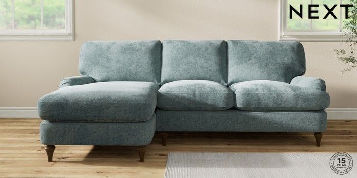 7.0.3 Buy Sadie Deep Relaxed Sit Medium Sofa Chaise - Left Hand Chunky Chenille Light Teal Green High Slim Turned - Mid from the Next UK online shop Click here to use our accessible website