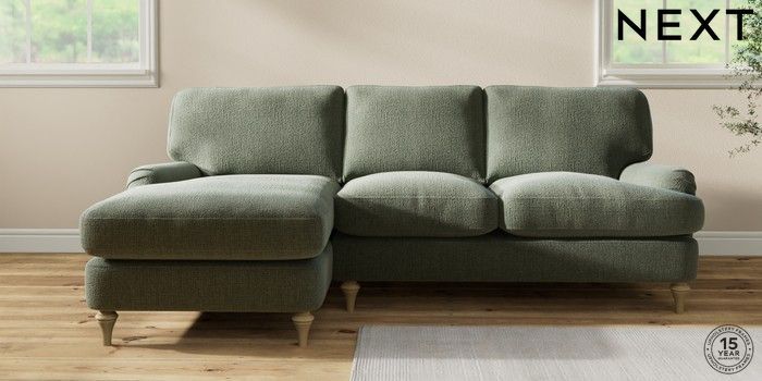 7.0.3 Buy Sadie Deep Relaxed Sit Medium Sofa Chaise - Left Hand Chunky Texture Mid Forest Green High Slim Turned - Light from the Next UK online shop Click here to use our accessible website