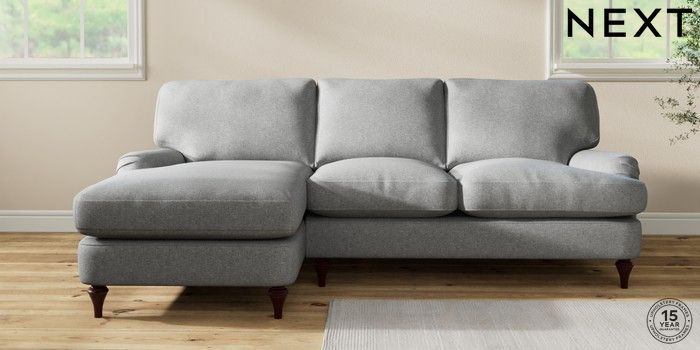7.0.3 Buy Sadie Deep Relaxed Sit Medium Sofa Chaise - Left Hand Chunky Weave Mid Grey High Slim Turned - Dark Brown from the Next UK online shop Click here to use our accessible website