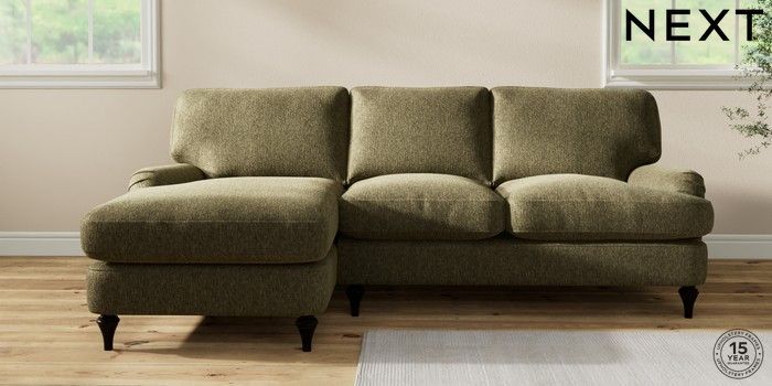 7.0.3 Buy Sadie Deep Relaxed Sit Medium Sofa Chaise - Left Hand Cotswold Chenille Dark Green High Slim Turned - Dark from the Next UK online shop Click here to use our accessible website