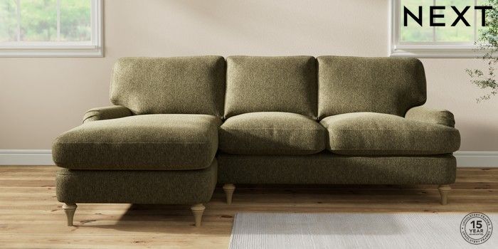 7.0.3 Buy Sadie Deep Relaxed Sit Medium Sofa Chaise - Left Hand Cotswold Chenille Dark Green High Slim Turned - Light from the Next UK online shop Click here to use our accessible website