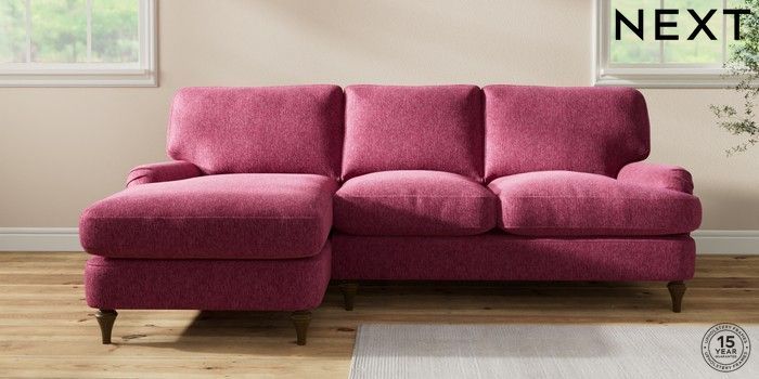 7.0.3 Buy Sadie Deep Relaxed Sit Medium Sofa Chaise - Left Hand Cotswold Chenille Dark Raspberry Pink High Slim Turned - Mid from the Next UK online shop Click here to use our accessible website