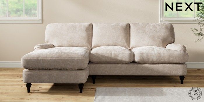 7.0.3 Buy Sadie Deep Relaxed Sit Medium Sofa Chaise - Left Hand Distressed Velour Mid Natural High Slim Turned - Dark from the Next UK online shop Click here to use our accessible website