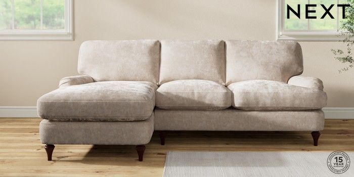 7.0.3 Buy Sadie Deep Relaxed Sit Medium Sofa Chaise - Left Hand Distressed Velour Mid Natural High Slim Turned - Dark Brown from the Next UK online shop Click here to use our accessible website