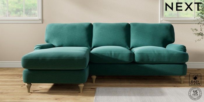 7.0.3 Buy Sadie Deep Relaxed Sit Medium Sofa Chaise - Left Hand Fine Chenille Easy Clean Dark Juniper Green High Slim Turned - Light from the Next UK online shop Click here to use our accessible website