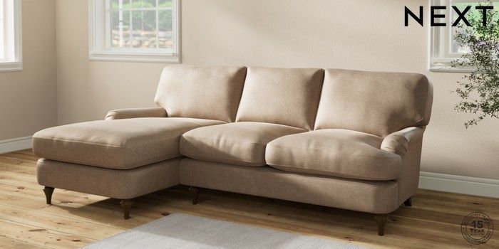 6.12.1 Buy Sadie Deep Relaxed Sit Medium Sofa Chaise - Left Hand Luxe Chenille Mid Camel Beige High Slim Turned - Mid from the Next UK online shop Click here to use our accessible website