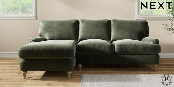 7.0.3 Buy Sadie Deep Relaxed Sit Medium Sofa Chaise - Left Hand Luxe Chenille Mid Green High Slim Turned - Light from the Next UK online shop Click here to use our accessible website