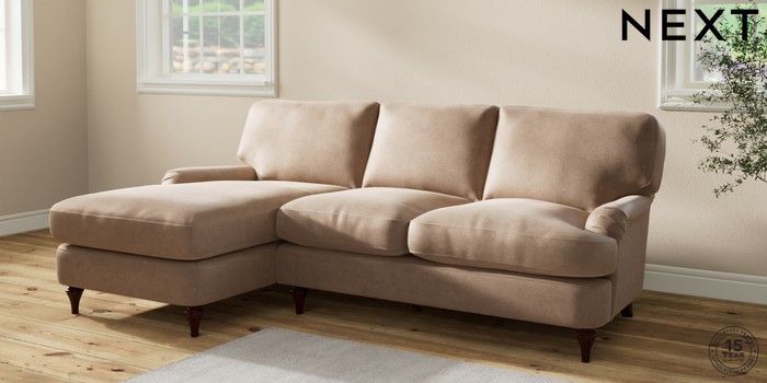 6.12.1 Buy Sadie Deep Relaxed Sit Medium Sofa Chaise - Left Hand Luxe Chenille Mid Natural High Slim Turned - Dark Brown from the Next UK online shop Click here to use our accessible website