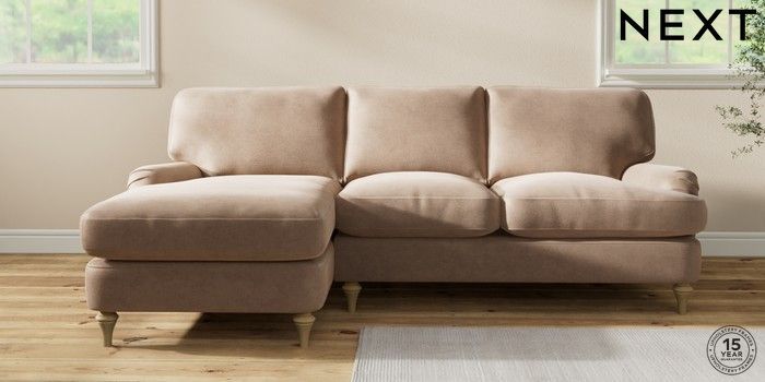 7.0.3 Buy Sadie Deep Relaxed Sit Medium Sofa Chaise - Left Hand Luxe Chenille Mid Natural High Slim Turned - Light from the Next UK online shop Click here to use our accessible website
