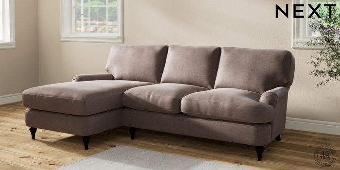 6.12.1 Buy Sadie Deep Relaxed Sit Medium Sofa Chaise - Left Hand Luxe Chenille Mink Brown High Slim Turned - Dark from the Next UK online shop Click here to use our accessible website