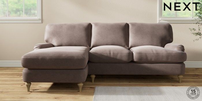 7.0.3 Buy Sadie Deep Relaxed Sit Medium Sofa Chaise - Left Hand Luxe Chenille Mink Brown High Slim Turned - Light from the Next UK online shop Click here to use our accessible website