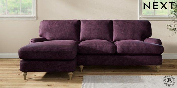 7.0.3 Buy Sadie Deep Relaxed Sit Medium Sofa Chaise - Left Hand Plush Chenille Dark Plum Purple High Slim Turned - Light from the Next UK online shop Click here to use our accessible website