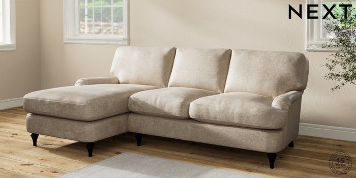 6.12.1 Buy Sadie Deep Relaxed Sit Medium Sofa Chaise - Left Hand Plush Chenille Light Natural High Slim Turned - Dark from the Next UK online shop Click here to use our accessible website