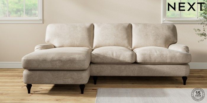 7.0.3 Buy Sadie Deep Relaxed Sit Medium Sofa Chaise - Left Hand Plush Chenille Light Natural High Slim Turned - Dark from the Next UK online shop Click here to use our accessible website