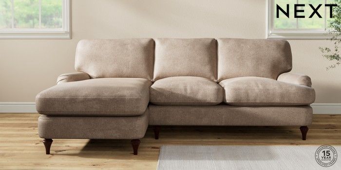 7.0.3 Buy Sadie Deep Relaxed Sit Medium Sofa Chaise - Left Hand Plush Chenille Mid Natural High Slim Turned - Dark Brown from the Next UK online shop Click here to use our accessible website