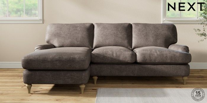 7.0.3 Buy Sadie Deep Relaxed Sit Medium Sofa Chaise - Left Hand Plush Chenille Mink Brown High Slim Turned - Light from the Next UK online shop Click here to use our accessible website