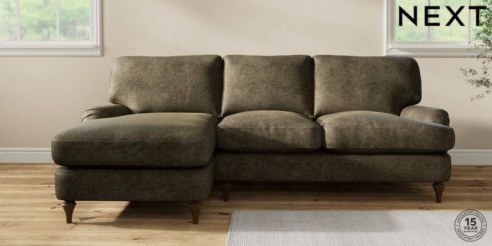 7.0.3 Buy Sadie Deep Relaxed Sit Medium Sofa Chaise - Left Hand Plush Chenille Moss Green High Slim Turned - Mid from the Next UK online shop Click here to use our accessible website