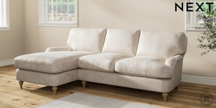 6.12.1 Buy Sadie Deep Relaxed Sit Medium Sofa Chaise - Left Hand Plush Chenille Oyster High Slim Turned - Light from the Next UK online shop Click here to use our accessible website