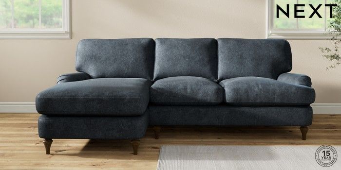 7.0.3 Buy Sadie Deep Relaxed Sit Medium Sofa Chaise - Left Hand Plush Chenille Slate Blue High Slim Turned - Mid from the Next UK online shop Click here to use our accessible website