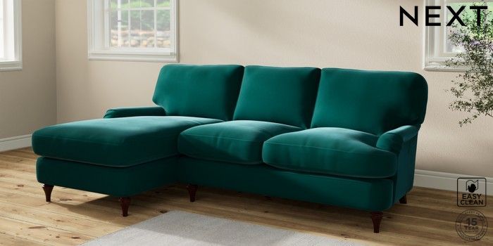 6.12.1 Buy Sadie Deep Relaxed Sit Medium Sofa Chaise - Left Hand Plush Velvet Easy Clean Juniper Green High Slim Turned - Dark Brown from the Next UK online shop Click here to use our accessible website