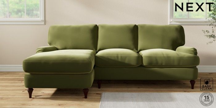7.0.3 Buy Sadie Deep Relaxed Sit Medium Sofa Chaise - Left Hand Plush Velvet Easy Clean Mid Olive Green High Slim Turned - Dark Brown from the Next UK online shop Click here to use our accessible website