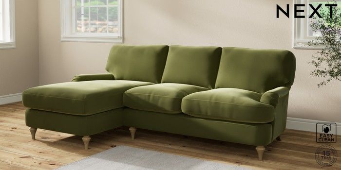 6.12.1 Buy Sadie Deep Relaxed Sit Medium Sofa Chaise - Left Hand Plush Velvet Easy Clean Mid Olive Green High Slim Turned - Light from the Next UK online shop Click here to use our accessible website