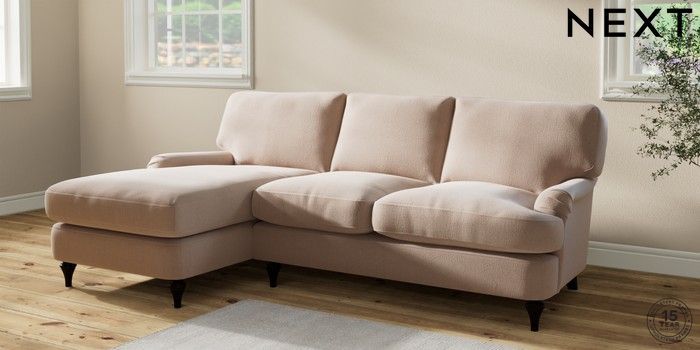 6.12.1 Buy Sadie Deep Relaxed Sit Medium Sofa Chaise - Left Hand Relaxed Linen Look Mid Natural High Slim Turned - Dark from the Next UK online shop Click here to use our accessible website
