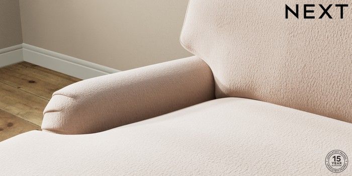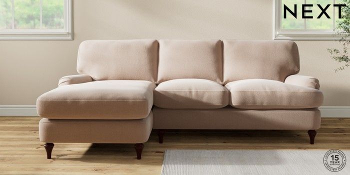 7.0.3 Buy Sadie Deep Relaxed Sit Medium Sofa Chaise - Left Hand Relaxed Linen Look Mid Natural High Slim Turned - Dark Brown from the Next UK online shop Click here to use our accessible website