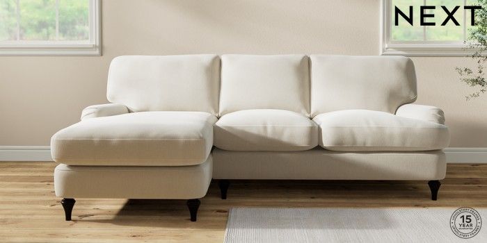 7.0.3 Buy Sadie Deep Relaxed Sit Medium Sofa Chaise - Left Hand Relaxed Linen Look Oyster High Slim Turned - Dark from the Next UK online shop Click here to use our accessible website