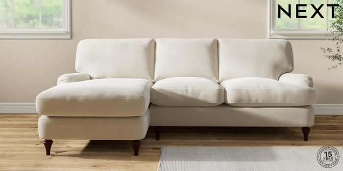 7.0.3 Buy Sadie Deep Relaxed Sit Medium Sofa Chaise - Left Hand Relaxed Linen Look Oyster High Slim Turned - Dark Brown from the Next UK online shop Click here to use our accessible website