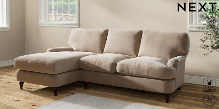 6.12.1 Buy Sadie Deep Relaxed Sit Medium Sofa Chaise - Left Hand Tweedy Blend Easy Clean Light Dove Natural High Slim Turned - Dark Brown from the Next UK online shop Click here to use our accessible website