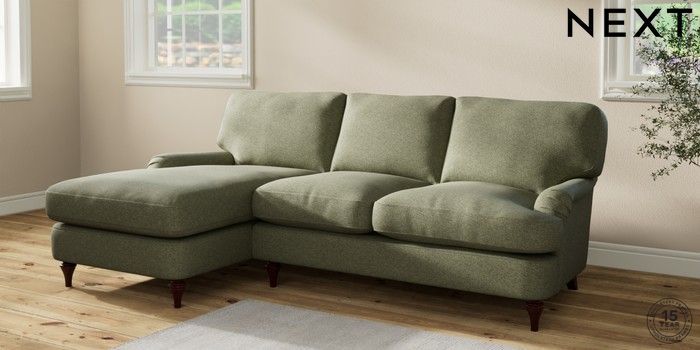 6.12.1 Buy Sadie Deep Relaxed Sit Medium Sofa Chaise - Left Hand Tweedy Chenille Mid Moss Green High Slim Turned - Dark Brown from the Next UK online shop Click here to use our accessible website