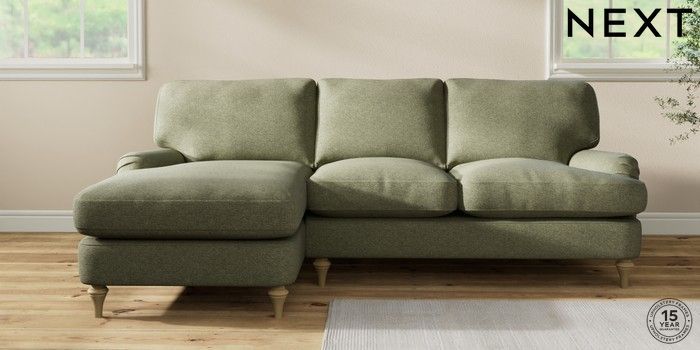 7.0.3 Buy Sadie Deep Relaxed Sit Medium Sofa Chaise - Left Hand Tweedy Chenille Mid Moss Green High Slim Turned - Light from the Next UK online shop Click here to use our accessible website