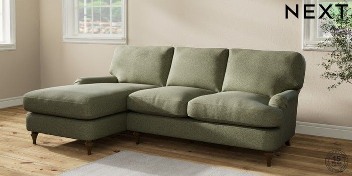 6.12.1 Buy Sadie Deep Relaxed Sit Medium Sofa Chaise - Left Hand Tweedy Chenille Mid Moss Green High Slim Turned - Mid from the Next UK online shop Click here to use our accessible website