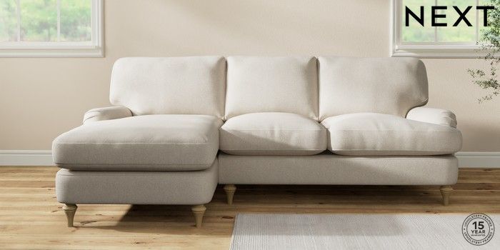7.0.3 Buy Sadie Deep Relaxed Sit Medium Sofa Chaise - Left Hand Tweedy Chenille Oyster High Slim Turned - Light from the Next UK online shop Click here to use our accessible website