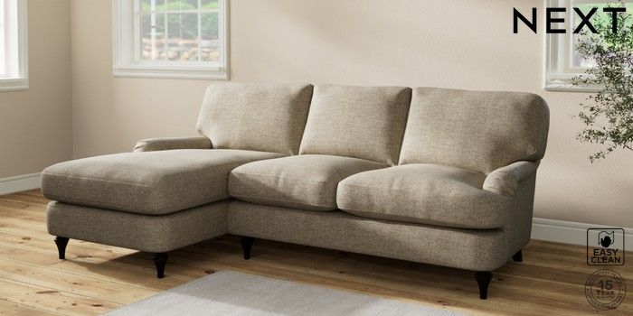 6.12.1 Buy Sadie Deep Relaxed Sit Medium Sofa Chaise - Left Hand Woven Chenille Easy Clean Mid Natural High Slim Turned - Dark from the Next UK online shop Click here to use our accessible website
