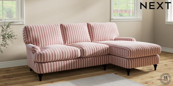 6.12.1 Buy Sadie Deep Relaxed Sit Medium Sofa Chaise - Right Hand Bold Chenille Stripe Dark Pink High Slim Turned - Dark from the Next UK online shop Click here to use our accessible website